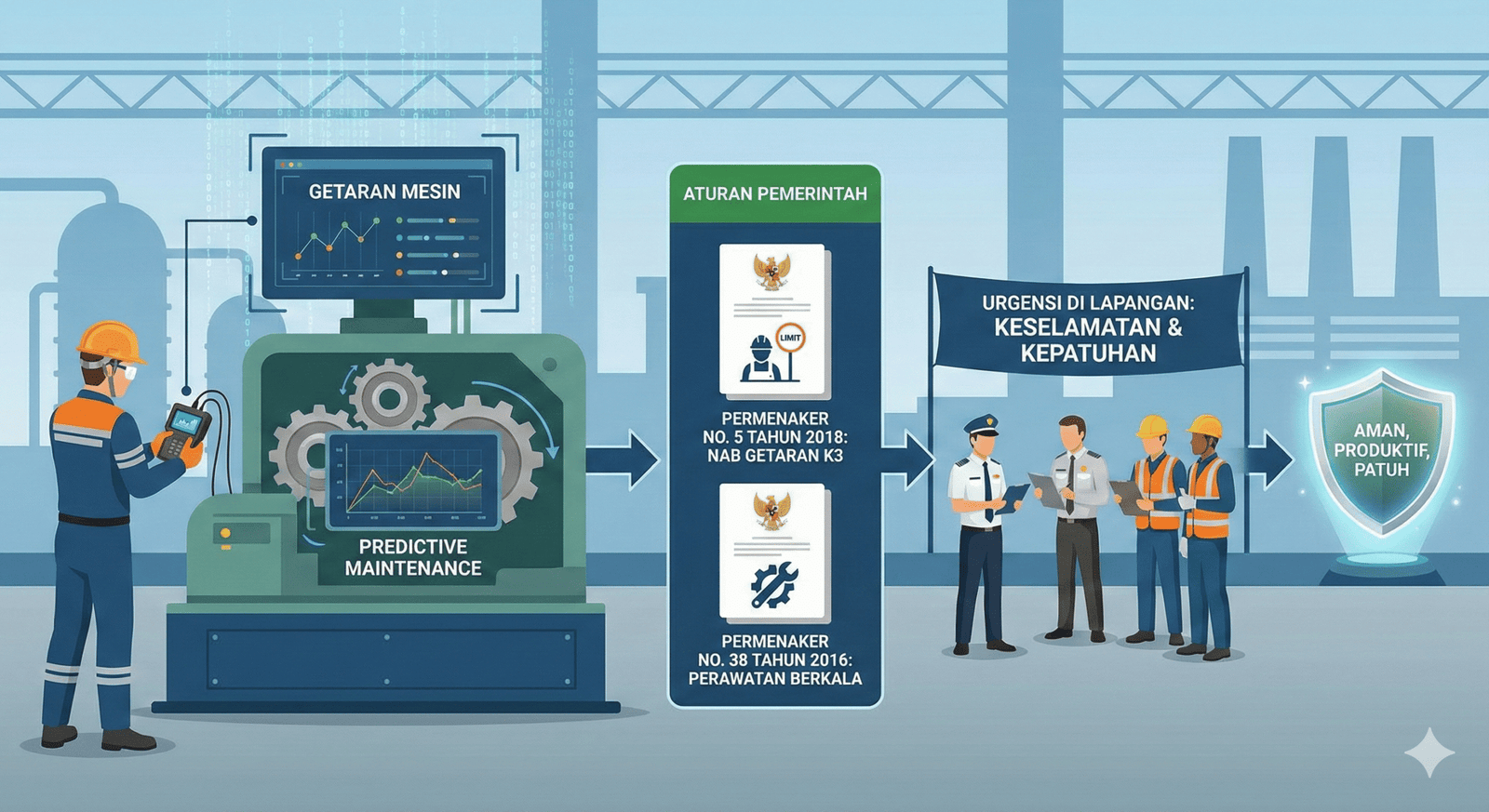- Permenaker No. 5 Tahun 2018 tentang K3 Lingkungan Kerja: Mengatur Nilai Ambang Batas (NAB) paparan getaran bagi pekerja. Mesin yang rusak getarannya akan merambat ke lantai kerja, dan jika melebihi NAB, perusahaan bisa terkena teguran atau sanksi karena membahayakan saraf dan sendi pekerja.