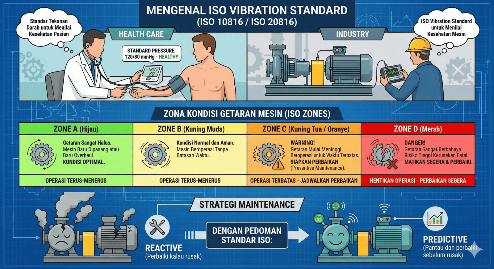 Sama seperti dokter yang merujuk pada standar tekanan darah untuk menilai kesehatan pasien, kita di dunia industri menggunakan ISO Vibration Standard (terutama ISO 10816 atau seri terbarunya ISO 20816) untuk menilai kesehatan mesin.