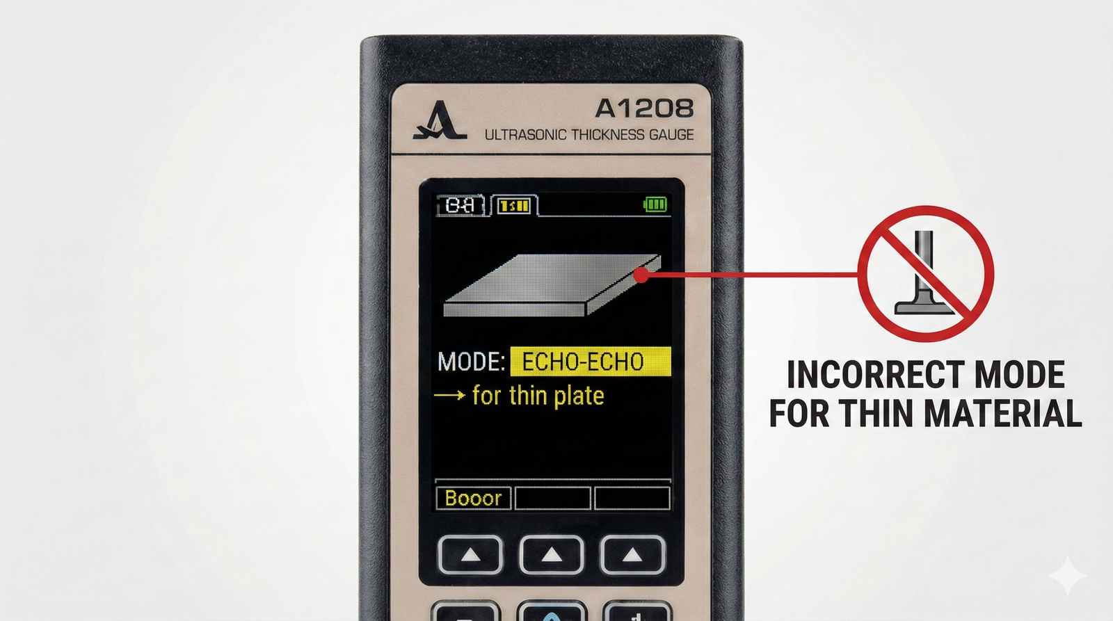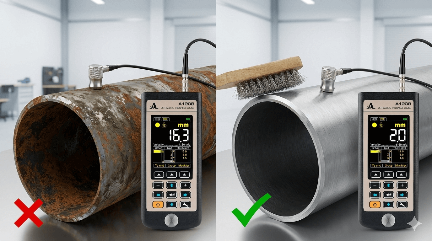 Gelombang ultrasonik tidak merambat secara optimal, sinyal pantul menjadi kacau, dan angka ketebalan bisa lebih tebal atau lebih tipis dari kondisi sebenarnya.