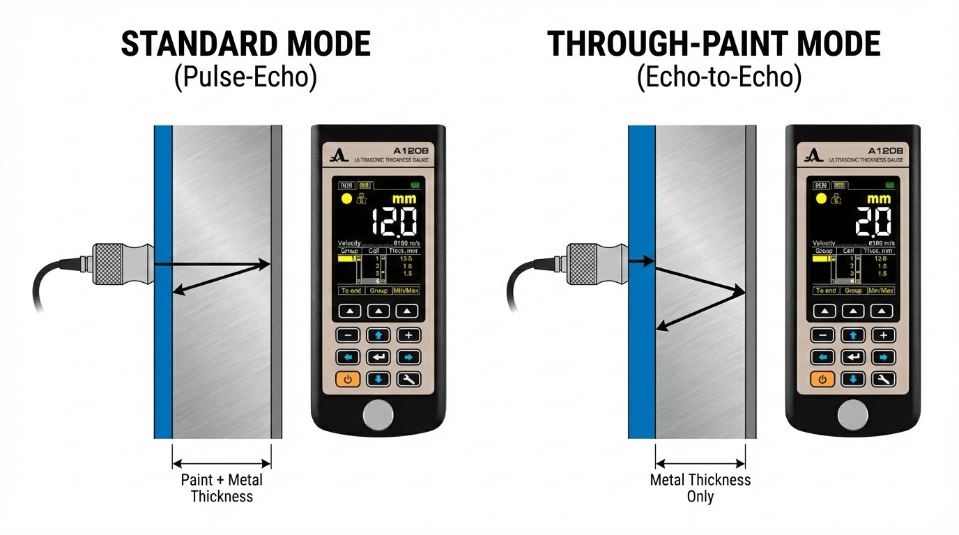 Perbedaan utama antara mode echo-to-echo dan mode standar terletak pada titik referensi pengukuran. Mode standar mengukur dari permukaan luar hingga permukaan dalam material, sehingga lapisan coating akan ikut terbaca sebagai bagian dari ketebalan.