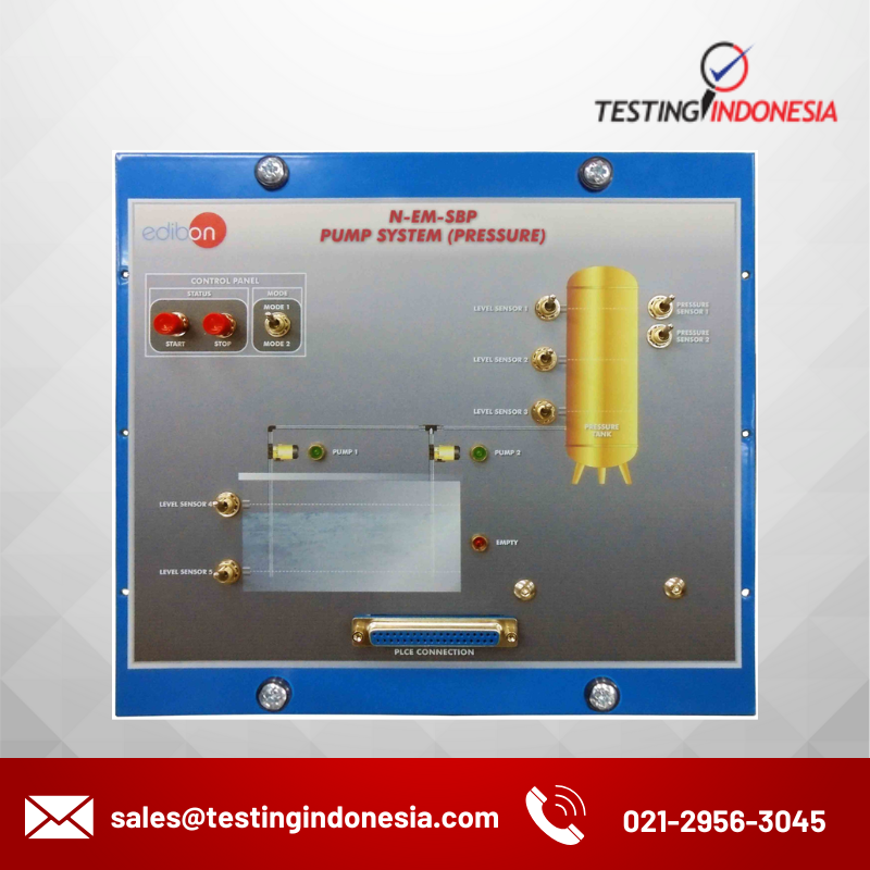 “N-EM-SBP” represents a pressure system, which emulates two pumps that fills a tank. The different switches and pushbuttons emulates the state of the three-phase contactor that control the pumps, the level sensors of the tank, the pressure sensor of the tank, etc.