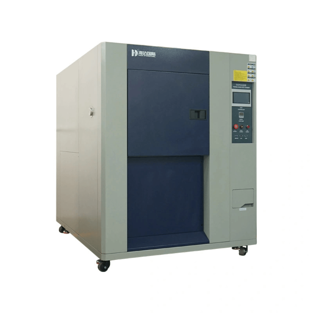 Thermal shock chamber ini terbagi menjadi tiga bagian utama: high temperature area, low temperature area, dan test area. Setiap area memiliki struktur isolasi yang unik untuk memastikan performa maksimal saat melakukan pengujian hot and cold impact test.
