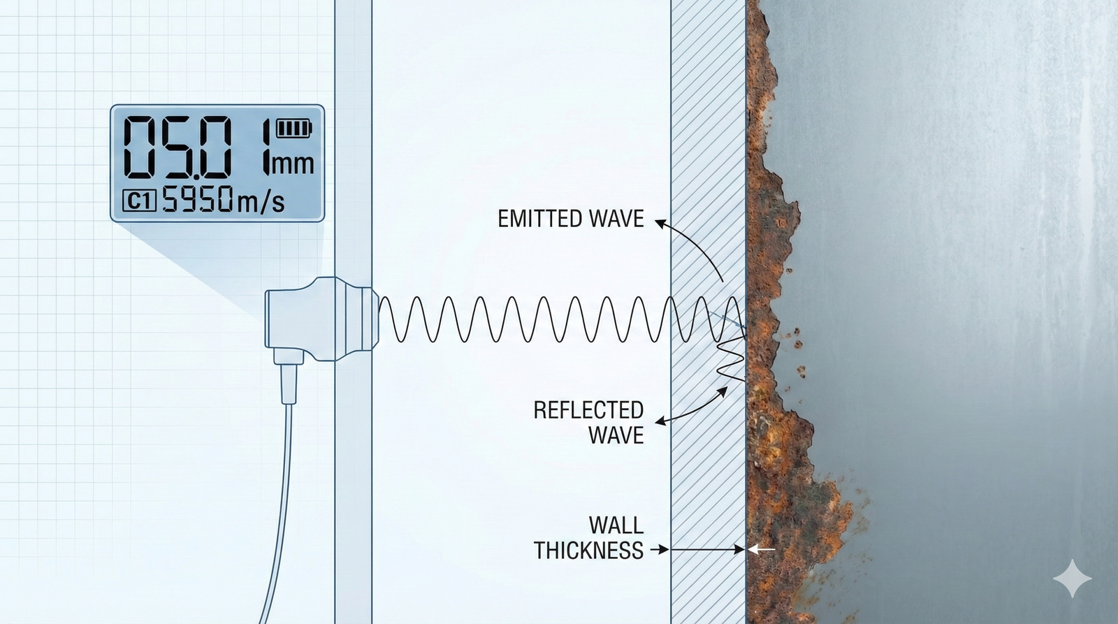 Alat ini menggunakan teknologi Ultrasonic Testing (UT). Sederhananya, alat ini menembakkan gelombang suara frekuensi tinggi ke dinding tangki.